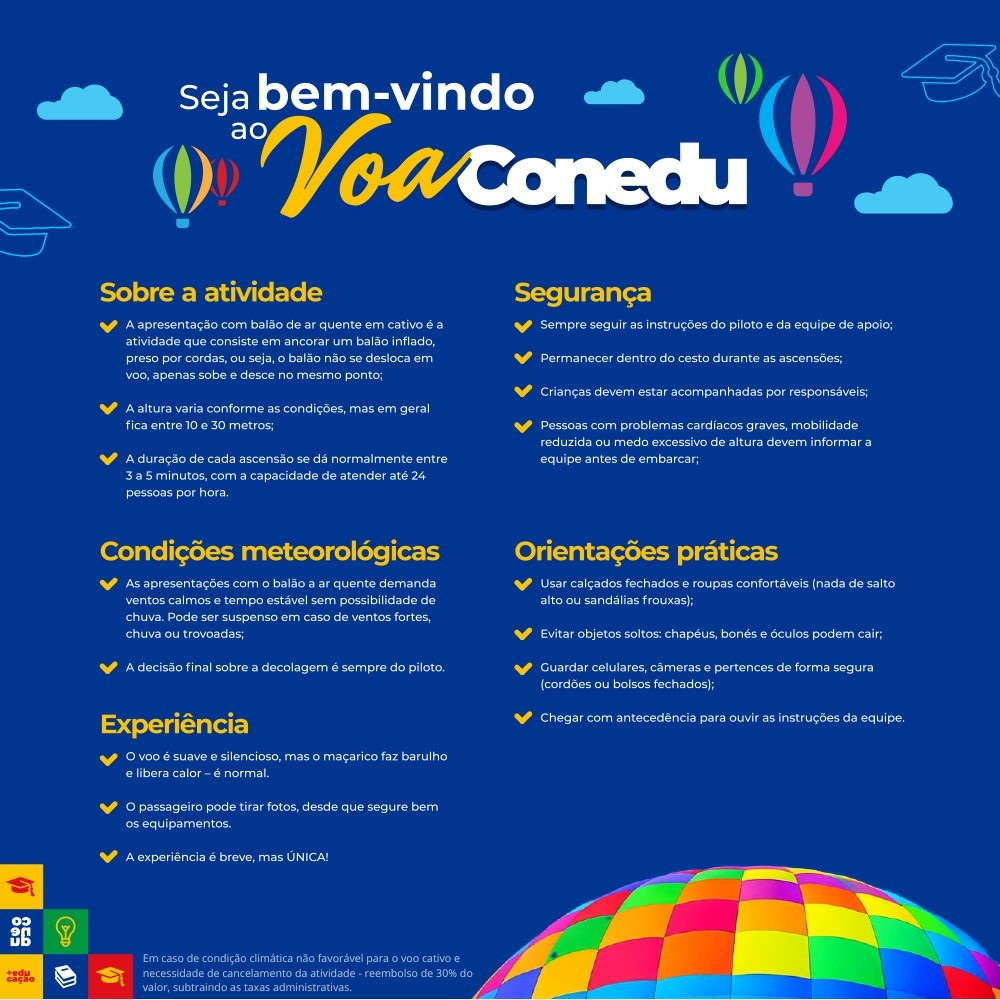 No dia 03 de outubro, das 18h às 20h, você poderá viver essa experiência única e segura no maior evento de educação do país, em um voo cativo de até 30 metros de altura. São minutos de pura emoção, perfeitos para fotos inesquecíveis e memórias que ficarão para sempre. Garanta já o seu acesso e faça parte dessa aventura especial!